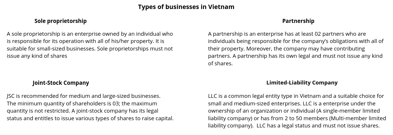For setting up a company in Vietnam, investors can form several kinds of legal entities, in which a Limited-Liability Company (LLC) and a Joint-Stock Company (JSC) are the most popular choices of foreign investors